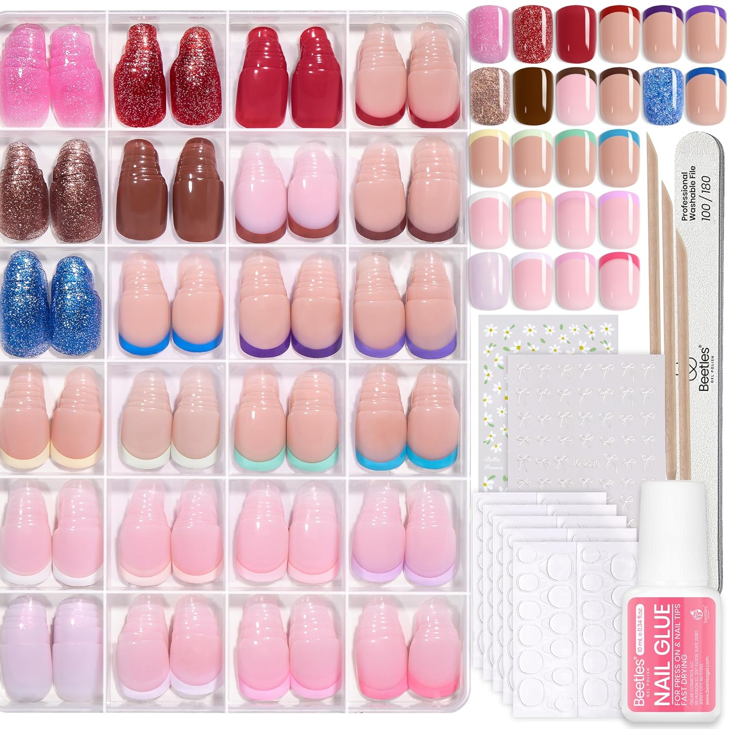 I personally like these nails: 8 matte solid colors, 4 glossy solid color, 8 colors glitter press on nails, 2 colors press on nails French tip black and white. 1 nude with white color and 1 nude with glitter color. Total 24 colors includes various styles and patterns. How can you not like these colors. Get them here.